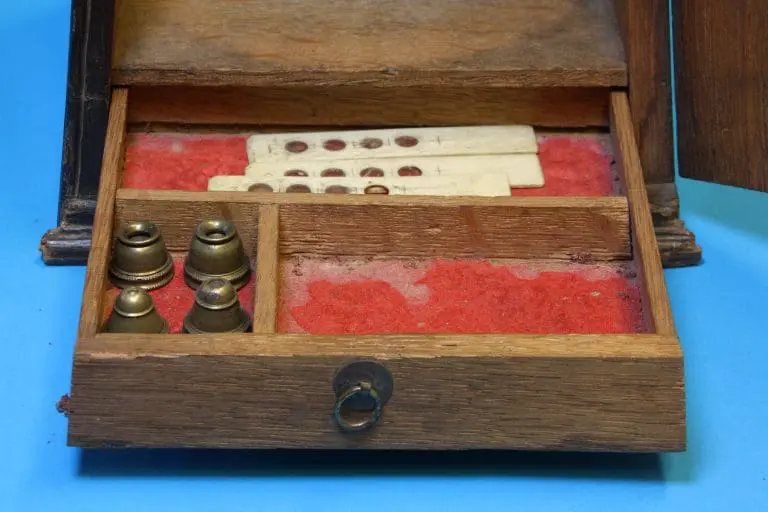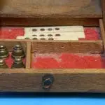 De bodem van het laatje is met rode stof bekleed. In het laatje bevinden zich vier objectieven, gevat in messing en gemerkt I, II, III en IIII. Aan het microscoop een vijfde objectief, gemerkt ‘IIII’.
