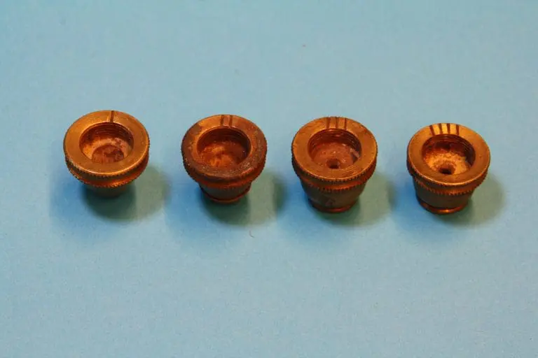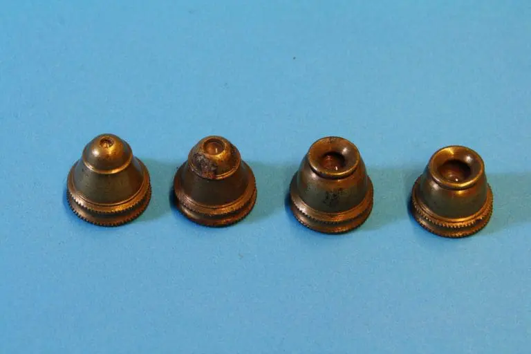 Aan de bovenzijde het oculair dat in buxushout is gevat. Deze tubus kan voor scherpstelling van het microscoop op en neer geschoven worden. Op het papier staan de posities voor de verschillende objectieflensjes aangegeven.