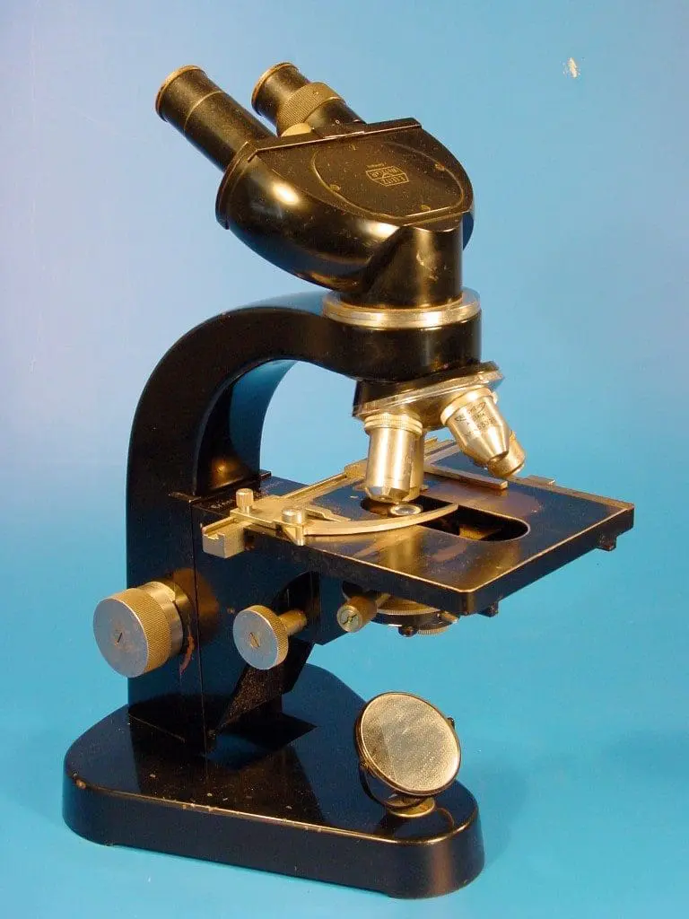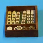 In het laatje twee objectieven, 1 en 2. Aan het microscoop zelf nog een derde objectief type ‘4’.