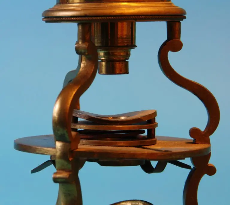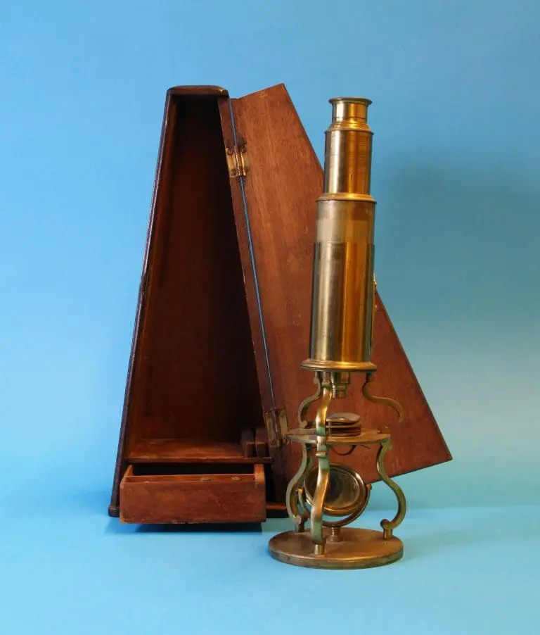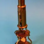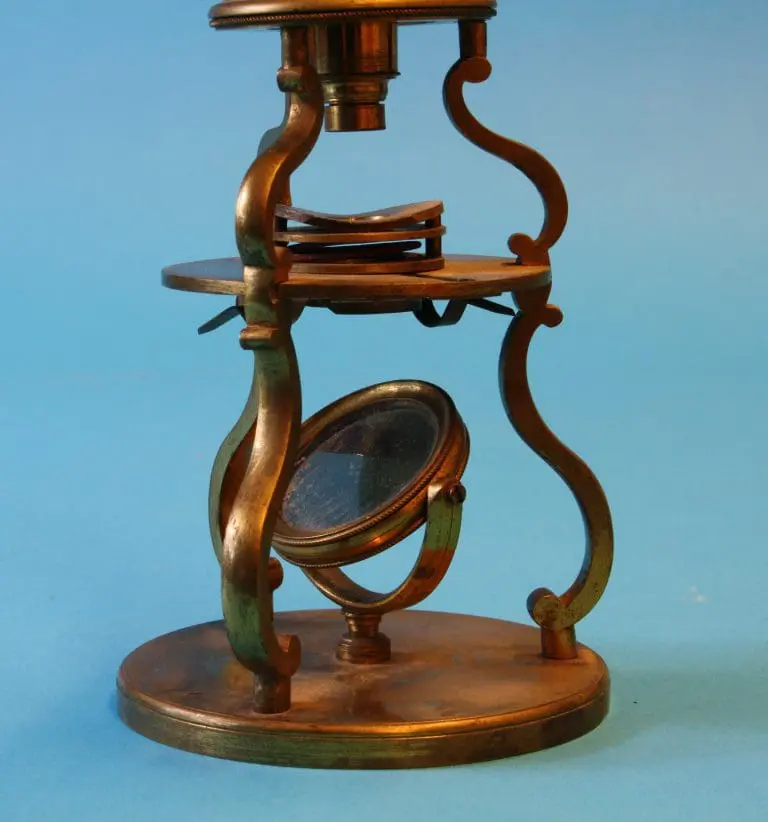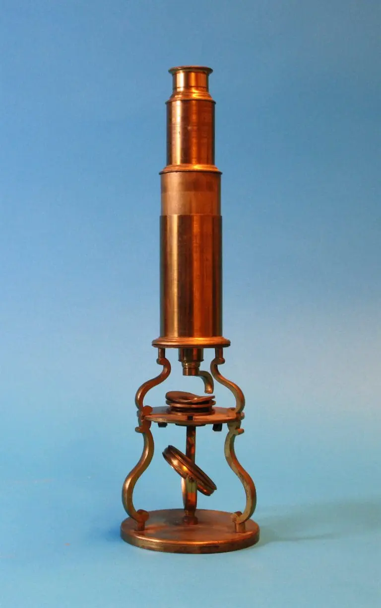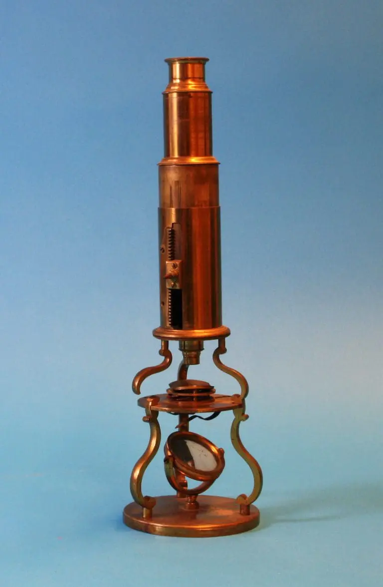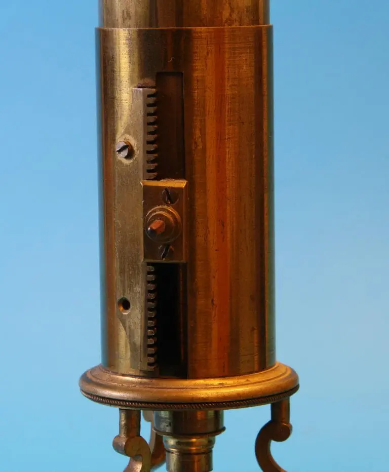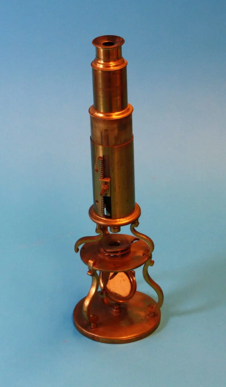 Dit is een voorbeeld van een laat model Culpeper driepootmicroscoop. Het instrument is geheel van messing, op de ronde voetplaat draaibaar in een beugel de spiegel. Op de voetplaat drie gekrulde messing poten waartussen halverwege de tafel is bevestigd. Op de poten een flens met bus waarin de tubus op en neer bewogen kan worden voor de scherpstelling. Scherpstelling is middels een tandheugel en een rondsel. De knop om het rondsel te draaien ontbreekt. Het onderste deel van de tubus heeft een vrij kleine diameter, hierover past een Lieberkühn-spiegel op een bus (deze ontbreekt). Er is een Bonanni-tafel met klemveer aanwezig.