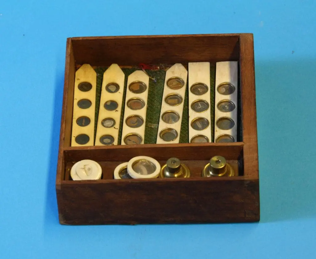 Verder zijn er zes benen preparaatschuifjes met elk vier preparaten, tussen mica ruitjes. Er zijn twee ronde benen preparaathoudertjes, in een benen doosje bevindt zich nog een veer die dient om de mica ruitjes in de houders te klemmen. Onder de tafel een flens met diametraal tegenover elkaar een uitholling en hierbij twee klemmen zodat er een buisje met (sloot)water onder de tafel geklemd kan worden.