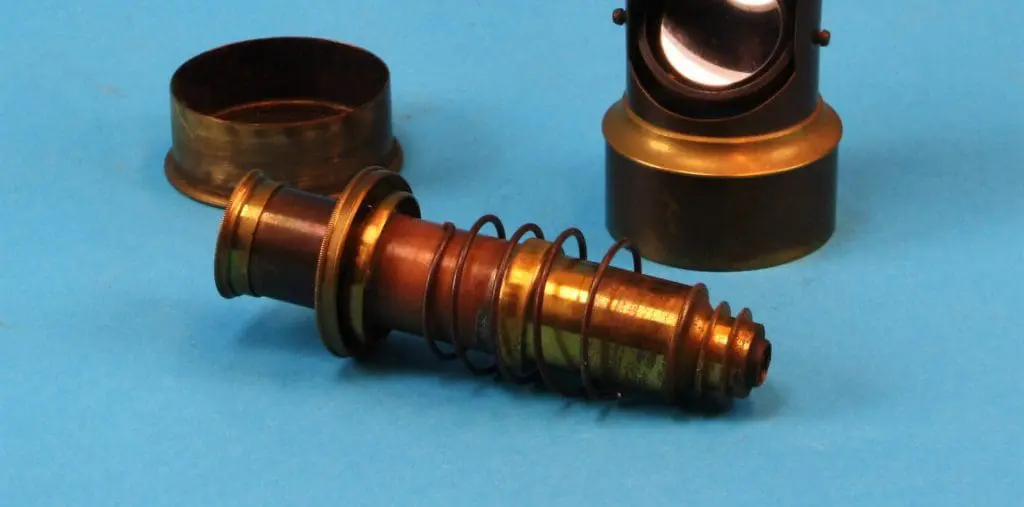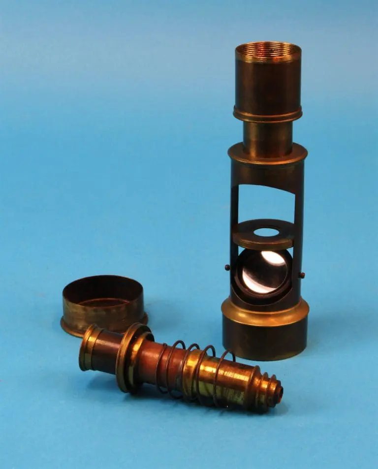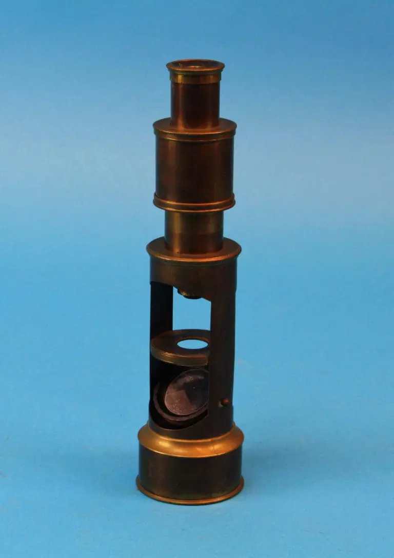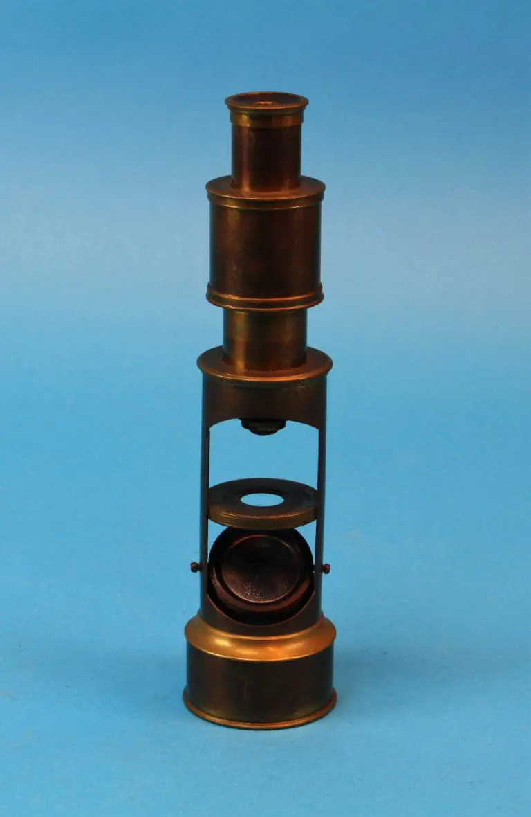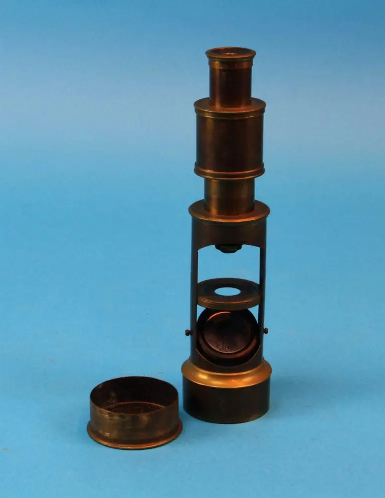 Trommelmicroscoop op holle voet, deze is voorzien van een deksel. De voor- en de achterzijde zijn geheel opengewerkt om ruimte voor het preparaat te creëren. Onderin een spiegel die om zijn as kan draaien, in het midden een tafel. Voorzien van een schuiftubus met veer die de tubus omhoog gedrukt houdt.
