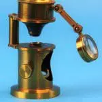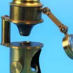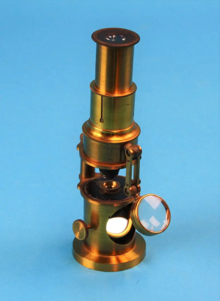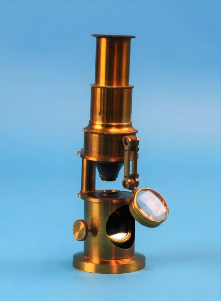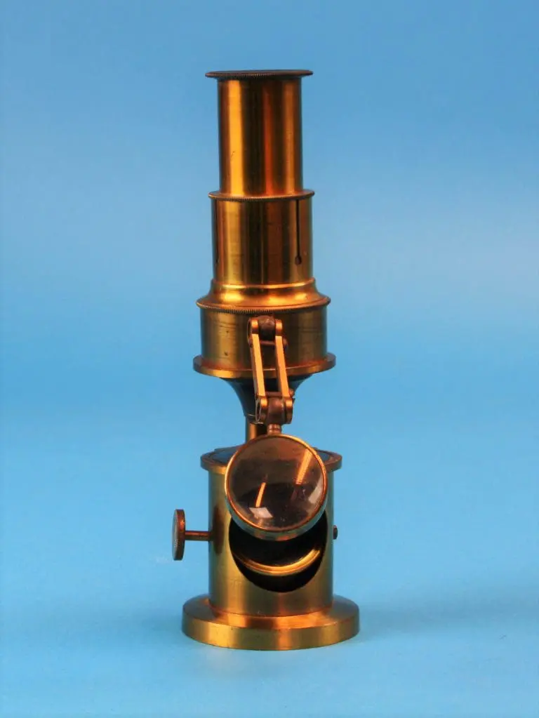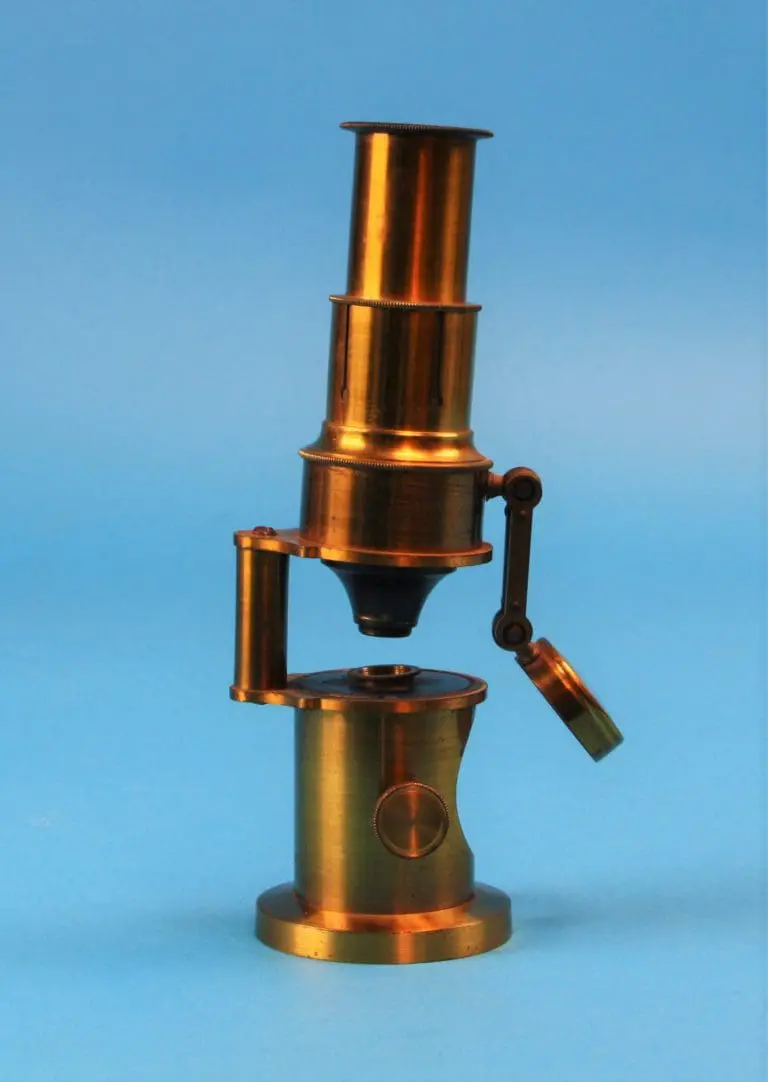 Klein trommelmicroscoop bestaande uit een ronde messing voet met cilinder, aan de voorzijde een ronde uitsparing waardoor het licht op de spiegel kan vallen, deze is draaibaar. Op de cilinder de ronde tafel met een korte zuil.Op deze zuil een bus waarin de tubus op en neer kan bewegen voor de scherpstelling.