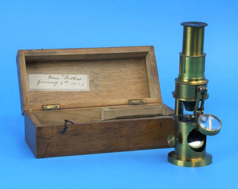 De maker van dit microscoop is onbekend, waarschijnlijk Frans.
