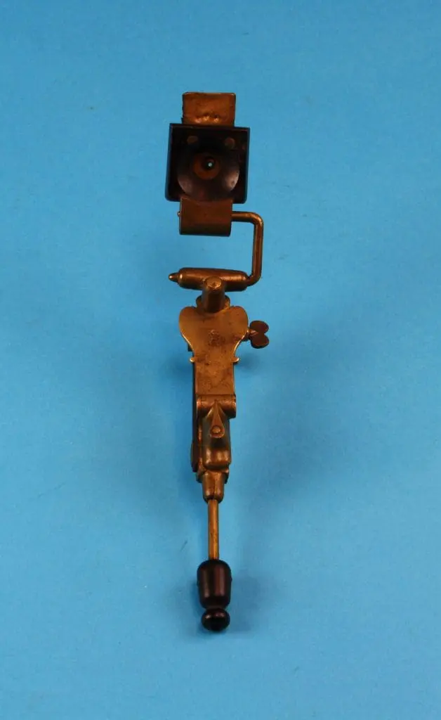 Het instrument bestaat uit een U-vormige voet van zwart gemoffeld gietijzer met daarop een vernikkelde ronde zuil. Op de statiefzuil een haaks koppelstuk dat in hoogte verstelbaar is. Hieraan een L vormige staaf waaraan het eigenlijke microscoop is geschroefd.